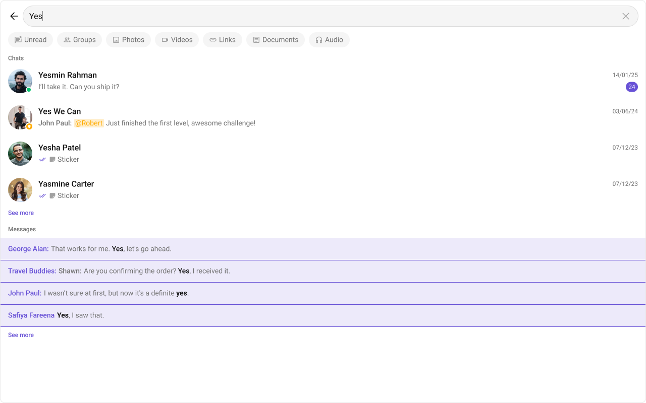 Search FiltersList of filters to be rendered in the Search component.searchFilters={[CometChatSearchFilter.Messages, CometChatSearchFilter.Photos, CometChatSearchFilter.Audio, CometChatSearchFilter.Documents]}